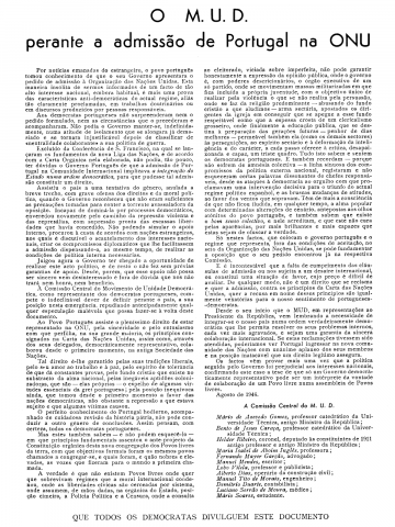 Em agosto de 1946, Mário de Azevedo Gomes e Bento de Jesus Caraça, ambos professores catedráticos da Universidade Técnica, foram os primeiros signatários, em nome da Comissão Central do M.U.D., do documento intitulado “O M.U.D. perante a admissão de Portugal na ONU”. Como sublinhava esse documento, "só um governo democraticamente representativo pode ser um intérprete da vontade de colaboração de um Povo livre numa assembleia de Povos livres".